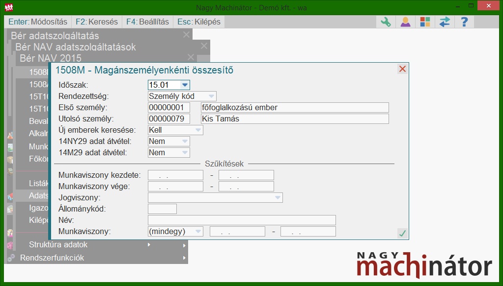 A 1508M menüpont elindítása után először az időszakot kell megadni. Az időszak megadása után, a beállított személyszűkítést figyelembe véve a program legenerálja az adatokat. A generálás végén megjelenő ablakban azok szerepelnek, akikre a tárgy időszakban a fentieknek megfelelő adatot talált a program. Még ebben az ablakban lehetőséget biztosít a program egyes emberek törlésére, vagy új emberek hozzáadására is. Az emberek adatait meg lehet tekinteni, ill. igény esetén módosítani is lehet azokat.