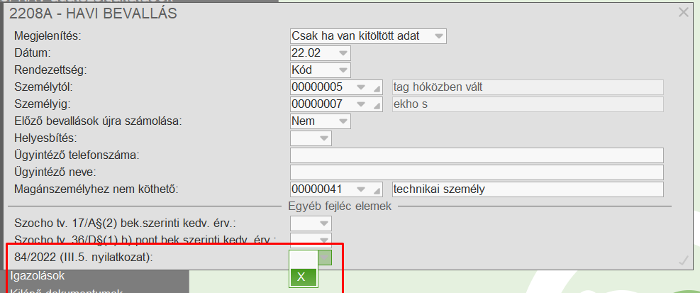 A 2208M-08-as lapon is jelölni szükséges, hogy melyik személynél kívánjuk igénybe venni a kedvezményt. Ezt a bevallásban kézzel kell x-elni, ennek átadására nincs lehetőség a programból.