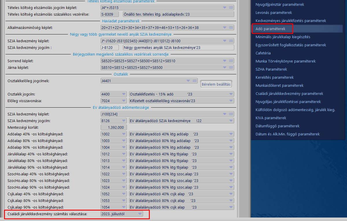 A családi járulékkedvezmény megállapítása július 15. előtt változatlan, azonban a harmadik negyedévet érintő hónapokat - amennyiben a vállalkozó jogosult a családi járulékkedvezmény érvényesítésére - újra kell számfejteni a verzióra történő frissítés után. Mivel a családi járulékkedvezmény alapjának megállapítása változik, így nem elegendő csak a számfejtéseket újra futtatni, hanem a negyedévre vonatkozó bérelemeket is újra kell generálni.