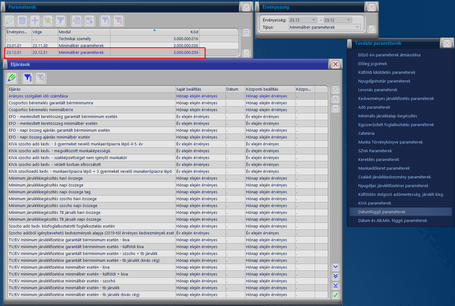 Ennek a problémának az áthidalására a Számfejtés paraméterek / Dátumfüggő paraméterekben definiálásra kerültek már korábban (2021. februárban is volt már egy évközi minimálbér emelés) a különböző eljárások. Ezen eljárásoknál a 186-os verzióra való frissítéssel a központi beállítás szerint az alábbiak szerint jár el a program, ha a minimálbért/garantált bérminimumot kell használnia: