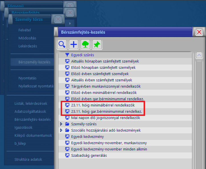 A kötelező legkisebb béremeléshez kapcsolódóan új központi szűrést hoztunk létre, amellyel csoportosan hajtható végre a béremelés a minimálbéres / garantált bérminimunos dolgozók számára.