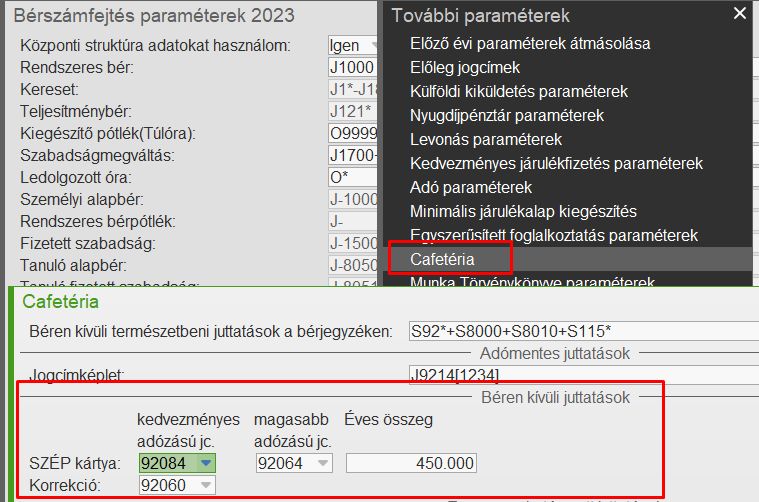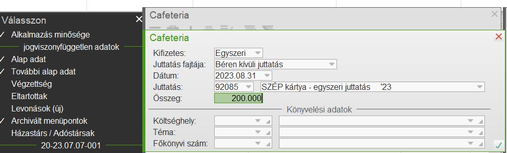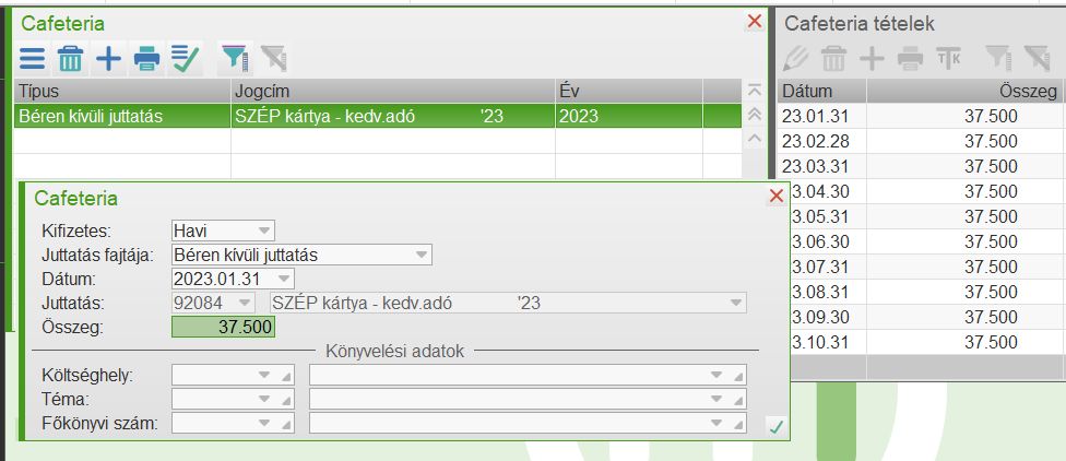 A Személytörzs / Cafetéria menüpontban 2023-tól, ha Béren kívüli juttatást rögzítünk, a jogcím nem módosítható, automatikusan a SZÉP kártya jogym kerül megajánlásra, valamint Havi típus esetén az éves keretösszeg tizenketted része: