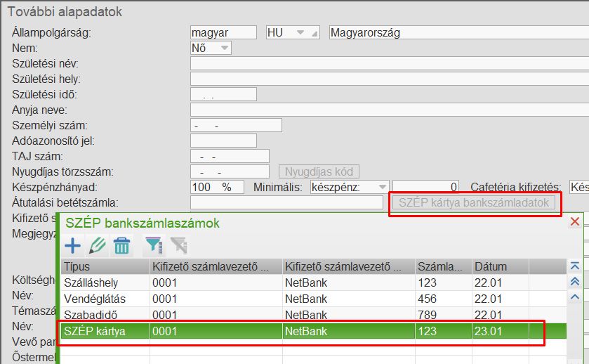 Amennyiben valaki nem kapott még SZÉP kártya juttatást, akkor a További alapadatok ablakban ki kell tölteni a SZÉP kártya bankszámlaadatokat "SZÉP kártya" típussal.