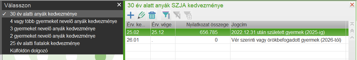 Az összeg mezőbe már nem kell írni semmit, a Jogcím oszlopban pedig csak a Magzat, vagy a (2026-tól) végű érték választható.
