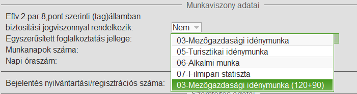 Amennyiben a fenti 120 napon túli időszakot szeretnénk számfejteni, az egyszerűsített foglalkoztatás rögzítésénél az alábbi jelleget kell választanunk: