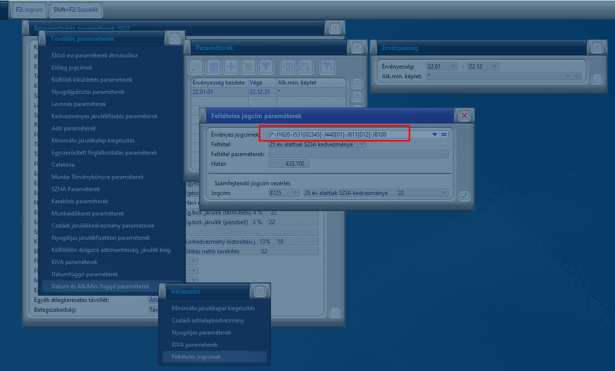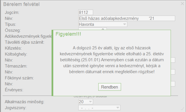 2022. január 1. után felvételre kerülő J8112-es első házas adóalap kedvezmény jogcím rögzítésénél a program megnézi, hogy a dolgozó 25 év alatti-e, és ha igen, akkor figyelmeztető üzenetet küld, hogy csak a 25. életév betöltése utántól adja meg a felhasználó a bérelem érvényességét.