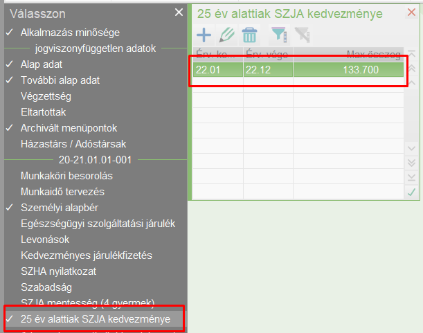 Fentiek miatt 2022. január 1. után az első alkalommal, amikor belép a felhasználó a személytörzsbe, lefut egy szűrés, és meg fogja mutatni azokat a dolgozókat, akinek van jelenleg érvényes első házasok adóalap kedvezménye rögzítve, valamint a születési dátumuk alapján 25 év alatt. Ezen dolgozóknál a felhasználónak kell arról gondoskodni, hogy az első házas kedvezmény érvényesítéséhez már felvett J8112-es jogcímet 2021.12.31-gyel lezárja, és felvegye újra megfelelő időtartamban attól a hónaptól, amikor a dolgozó már nem számít 25 év alattinak.