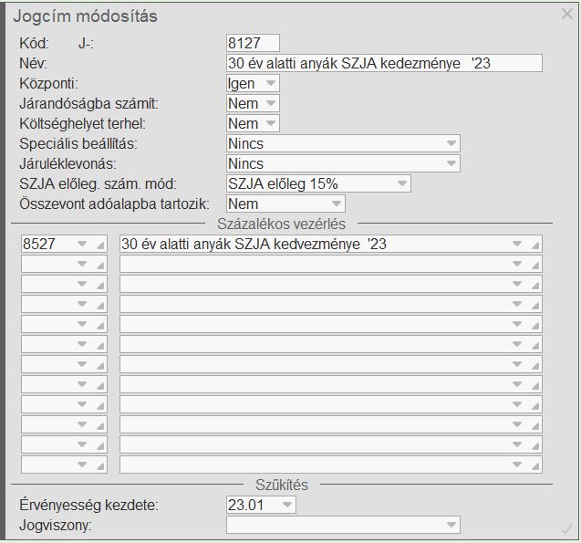 A jogcímképlet szerkeszthető, egyéni jogcímekkel kiegészíthető.