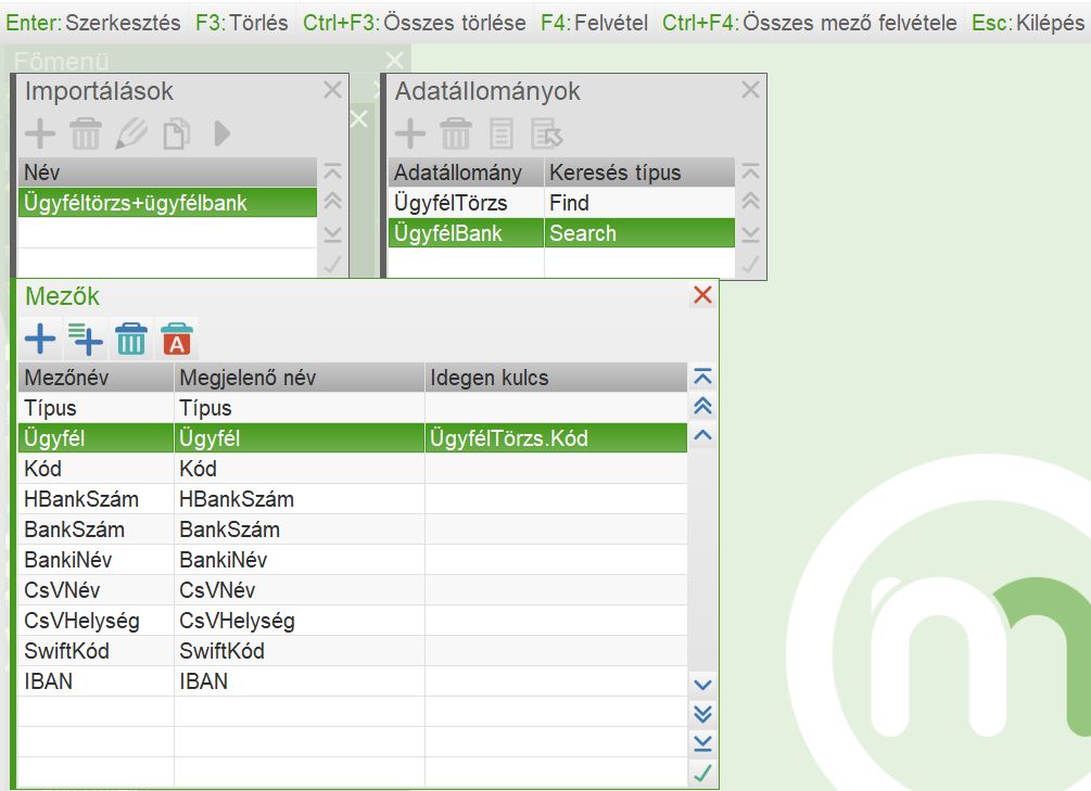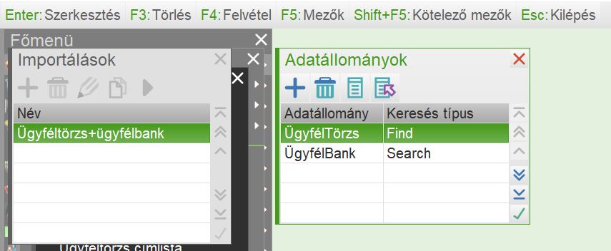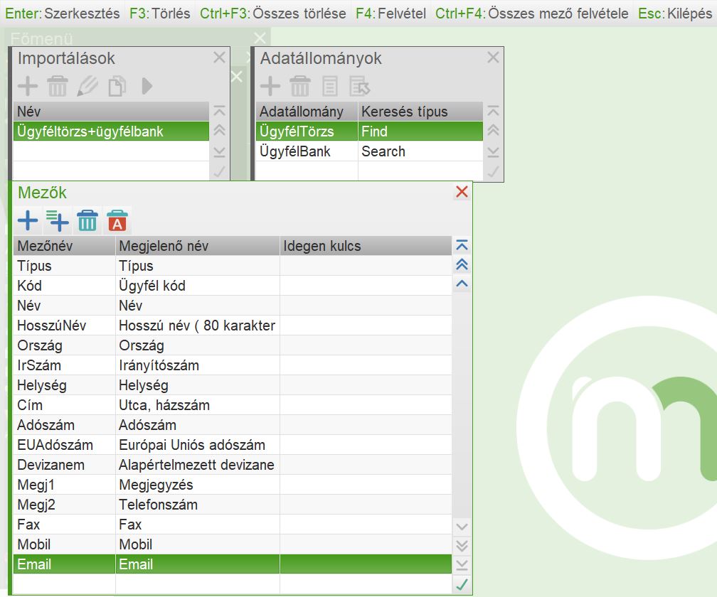 Ezután meg kell adni az egyes adatbázisok azon mezőit, melyeket fel kívánunk tölteni. Ezek között vannak kötelezően feltölthető, ill. feltölthető mezők. A Shift+F5:Kötelező mezők gombbal megkapjuk az adott adatbázis azon mezőit, melyet kötelező valamilyen adattal feltölteni, míg F5:Mezők gombbal az adatbázis összes mezője bekerül a listába. A kapott listából kézzel törölhetünk, ill. felvehetünk újat.