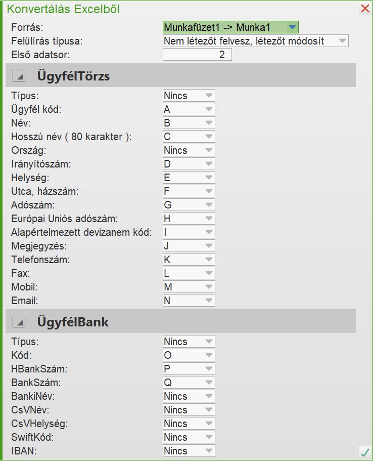 A betöltés nem kezeli le automatikusan a mező duplikációkat, pl. azonos ügyfélneveket (több Kovács János) az Excel táblában sorszámozni kell. Azok a mezők, amelyek nem lettek betöltve, az adatbázis konfigurációs leírója szerinti alapértéket kapják meg.