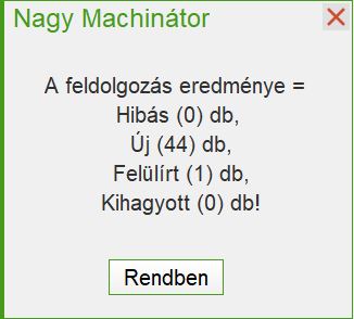 A betöltés után láthatjuk, hogy mennyi adat lett felvéve vagy módosítva, ill. van-e hibás, nem betöltött rekord. A végén formázható listát is kérhetünk a betöltés eredményéről.