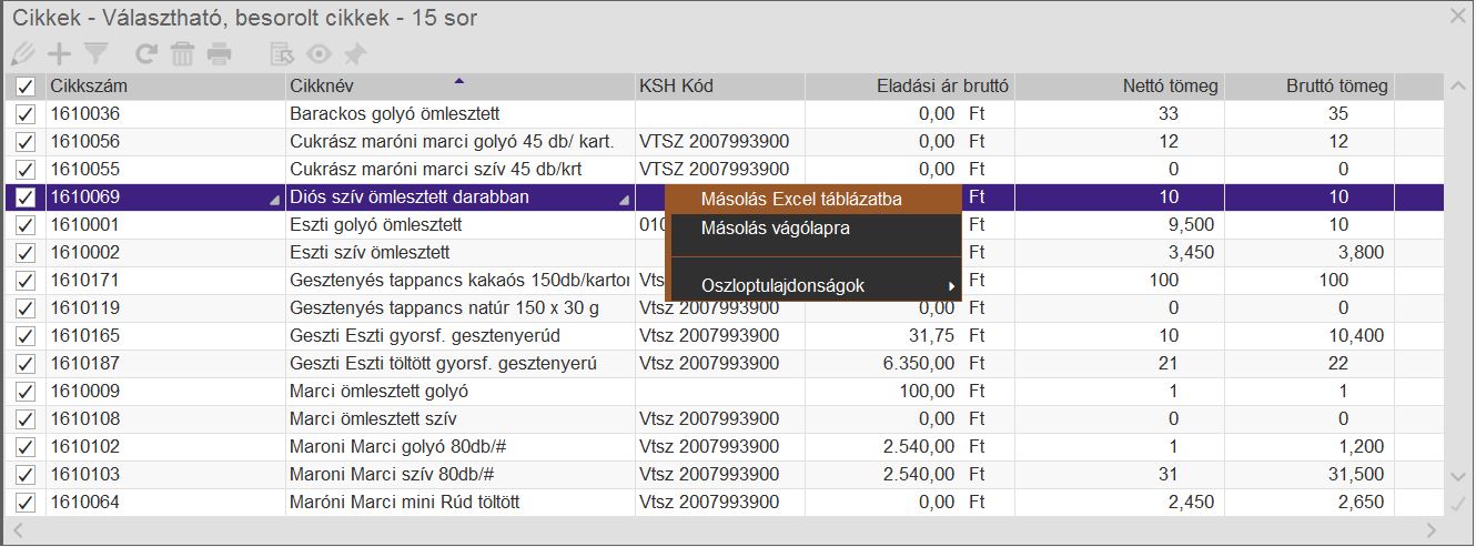 1. A leszűrt megfelelő adattartalmú és rendezettségű eredményhalmaz bármelyik adatmezőn jobb egér gombbal megjelenő gyorsmenüből Excelbe küldhető: