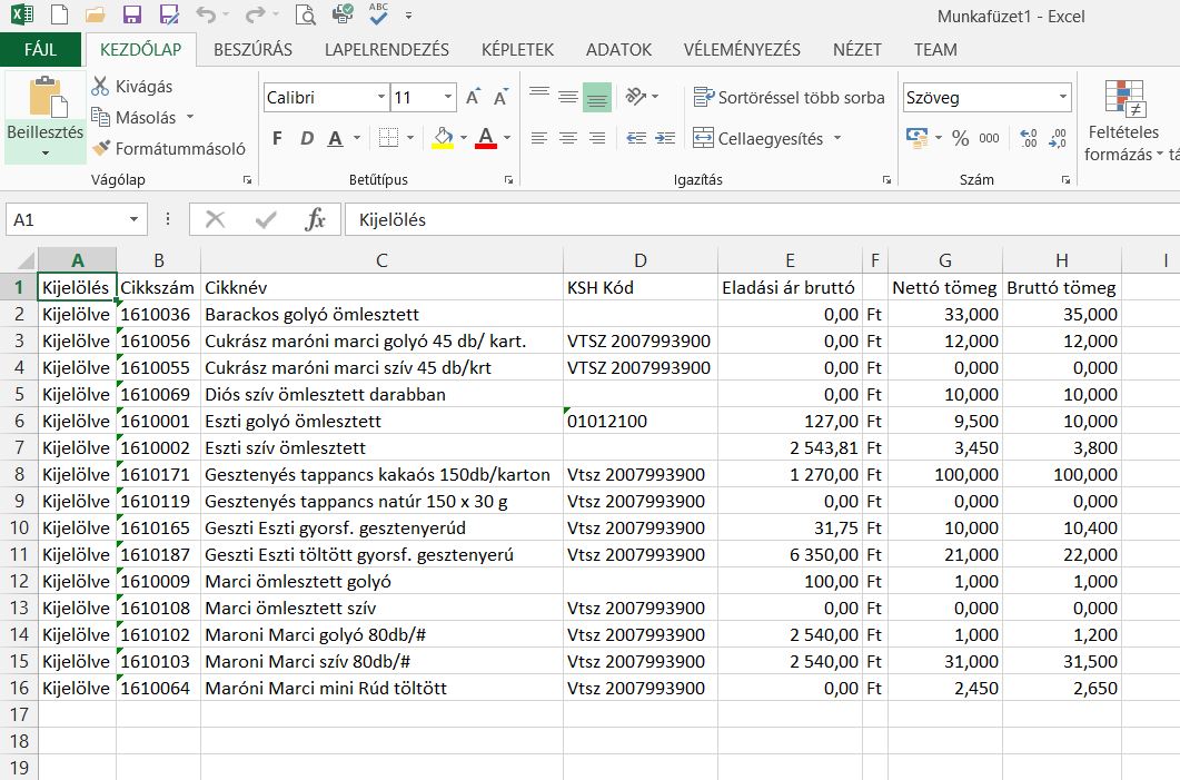 Az exportált adatok megjelennek egy Excel táblában. Ehhez szükséges a gépen telepített Excel program megléte.