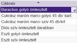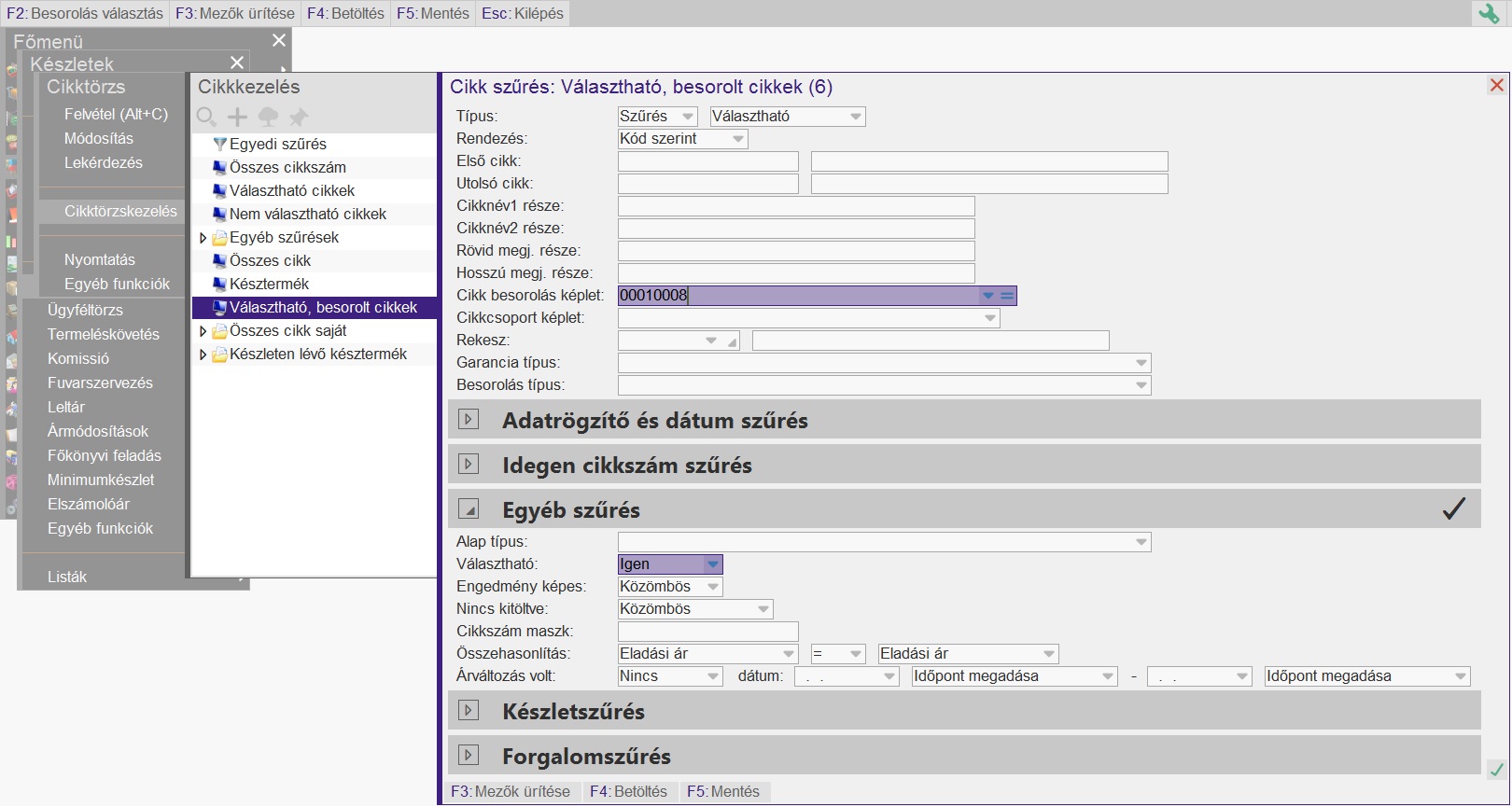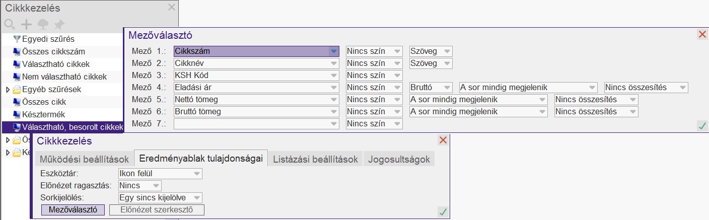 Példa: Szükségünk van azokra a cikkekre,amelyek választható állapotúak és beletartoznak egy meghatározott besorolásba. A szükséges mezők: cikkszám, cikknév, besorolási szám, bruttó ártábla1, nettó és bruttó tömeg. Az eredményt cikknév szerint rendezve szeretnénk látni.