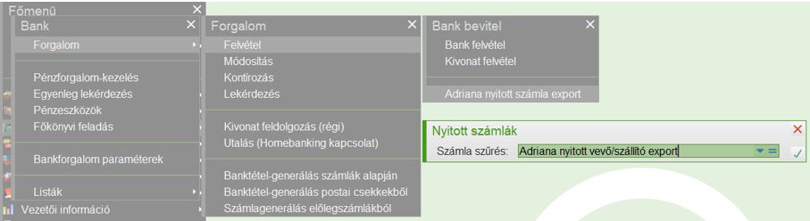 Lehetőség van Adriana rendszer felé átadni a nyitott vevői/szállítói számlákat.