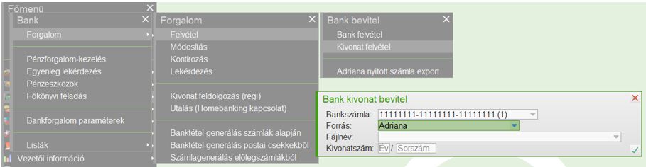 Adriana rendszerből előállított speciális CSV formátumú banki kivonat betöltésére van lehetőség.
