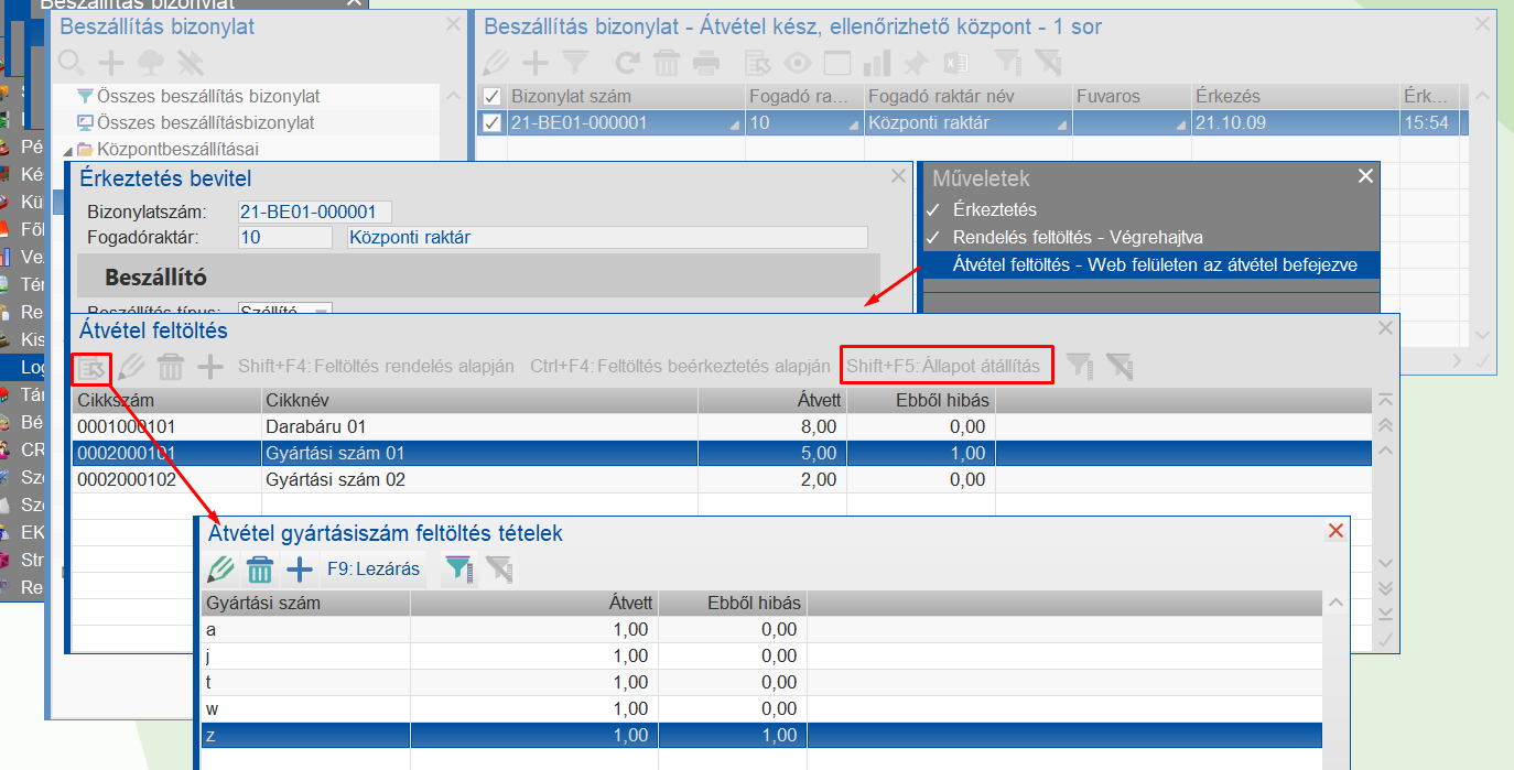 Az átvétel ablakban lehet megadni, hogy mely termékeket találták hibásnak az átvétel során.
