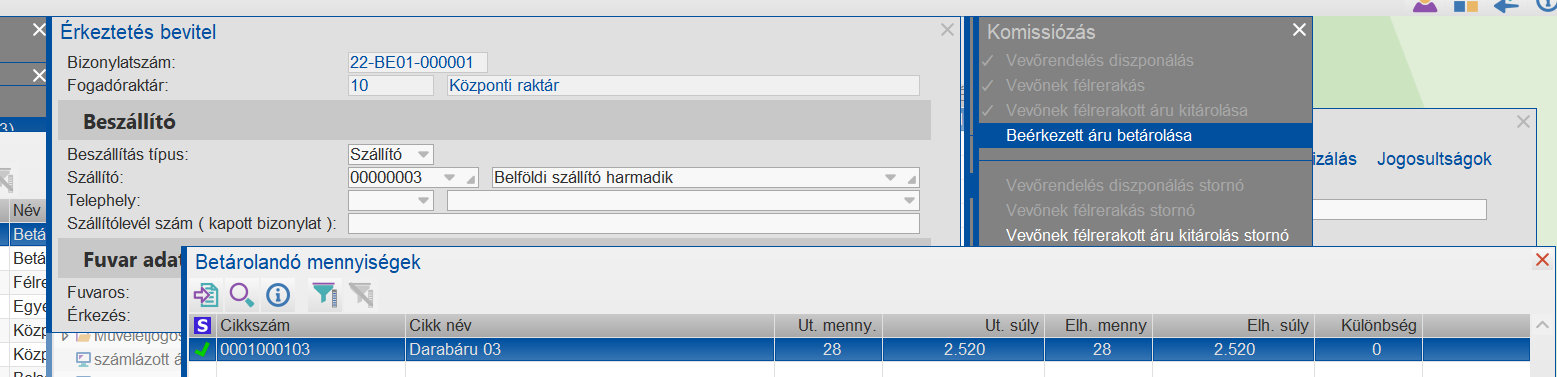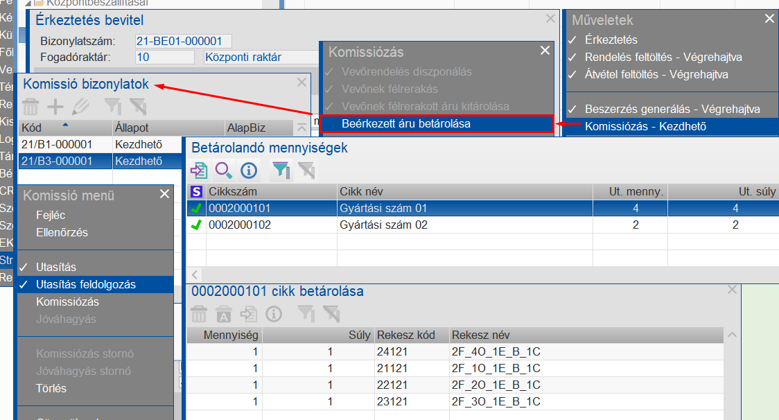 A beszállítás során egy külön menüpont szolgála a betárolási utasítások generálására.