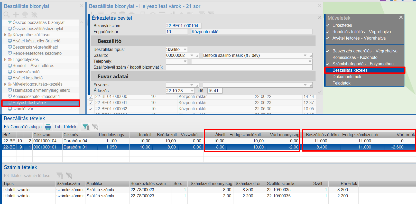 A Beszállítás kezelés almenüpontban lehet látni, hogy milyen eltéréseket tartunk nyilván értékben és mennyiségben.