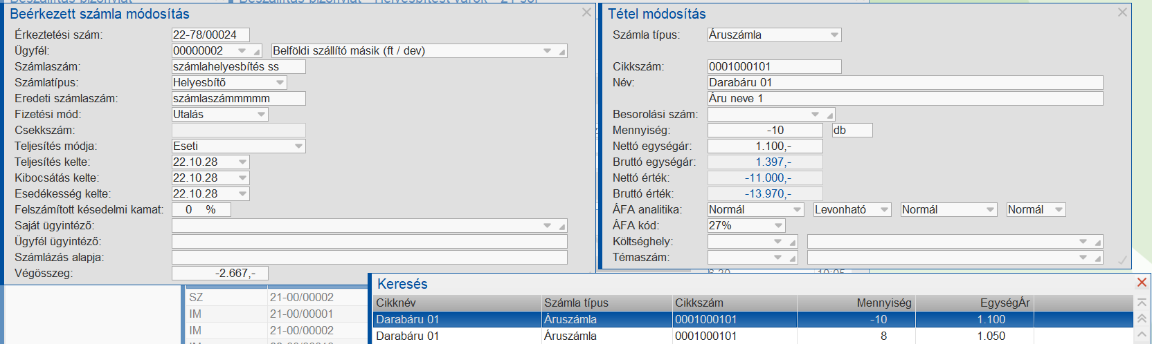 A helyesbítő számla érkeztetése esetén jó esetben olyan számlát kapunk amelyen a rosszul számlázott tétel negatív előjellel, a várt tétel pozitív előjellel szerepel.