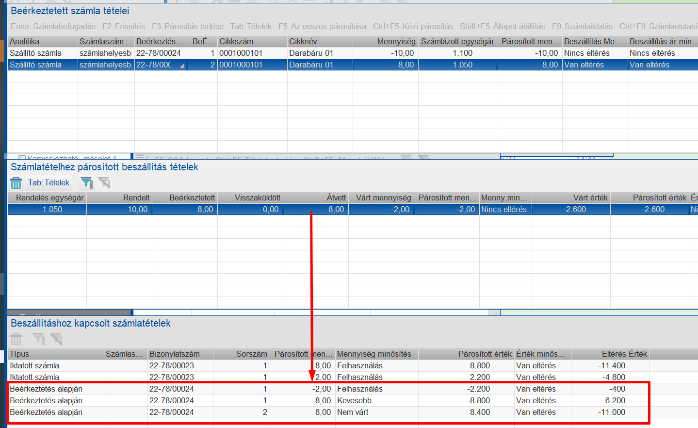 Ha ezt a párosítás elfogadjuk, és befogadjuk a számlát, akkor a beszállításunk a 11000 Ft-on lesz értékelve.