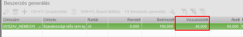 A beszerzésgenerálás menüpont alapvetően úgy működik, hogy a várt rendelések és az átvett adatok alapján a program automatikusan veszi fel és hasonlítja össze az adatokat és a beszerzés generálás menüpontban mennyiségre és egységárra vonatkozó értékeket nem lehet módosítani.