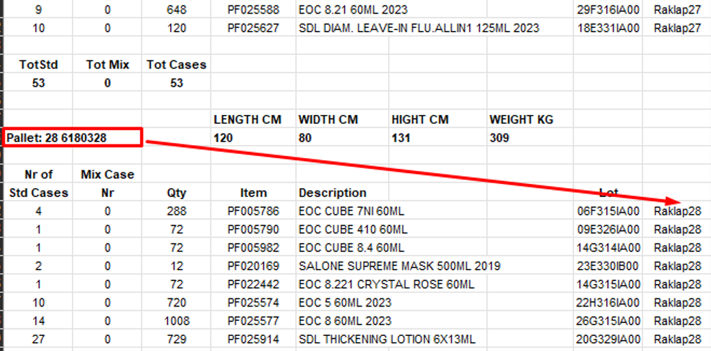 A szállító a szállítmány mellé Packinglist-et mellékel, amely tartalmazza a raklap azonosítókat is.
