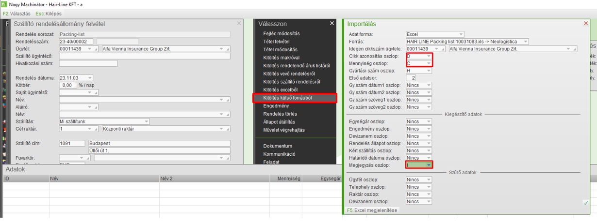 A módosított Excelt az alábbi menüpontban lehet feltölteni a szállítórendelések közé.