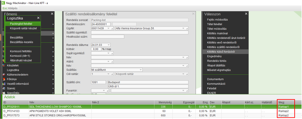 A feldolgozás után megjelenik a megjegyzés mezőben raklap azonosító