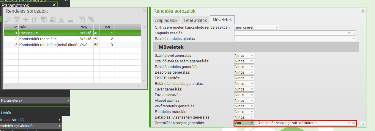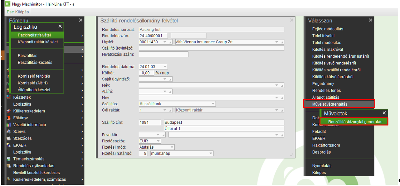 Beszállításbizonylat generálását a képen látható menüpontból közvetlenül a packinlist feldolgozása után végre lehet hajtani.