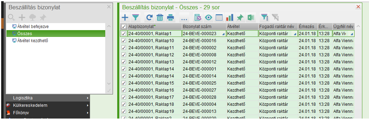 A legenerált beszállításbizonylatok alapbizonylat mezőjében láthatók a raklapok számai.