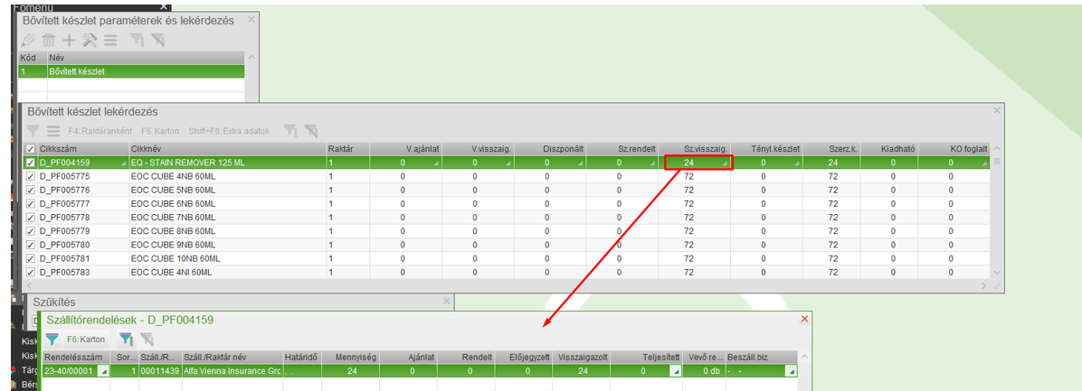 A bővitett készlet lekérdezésben a szállítóvisszaigazolt oszlopban látszik, hogy mennyi áru van átvétel alatt.