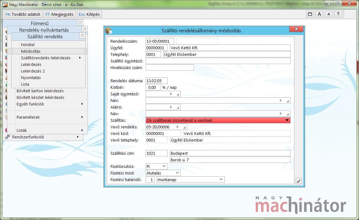 A program végső soron a Vevő (telephely) címét fogja megajánlani a szállítási cím mezőben, amit igény esetén még át lehet írni és az átírt cím kerül a kinyomtatott rendelésre.