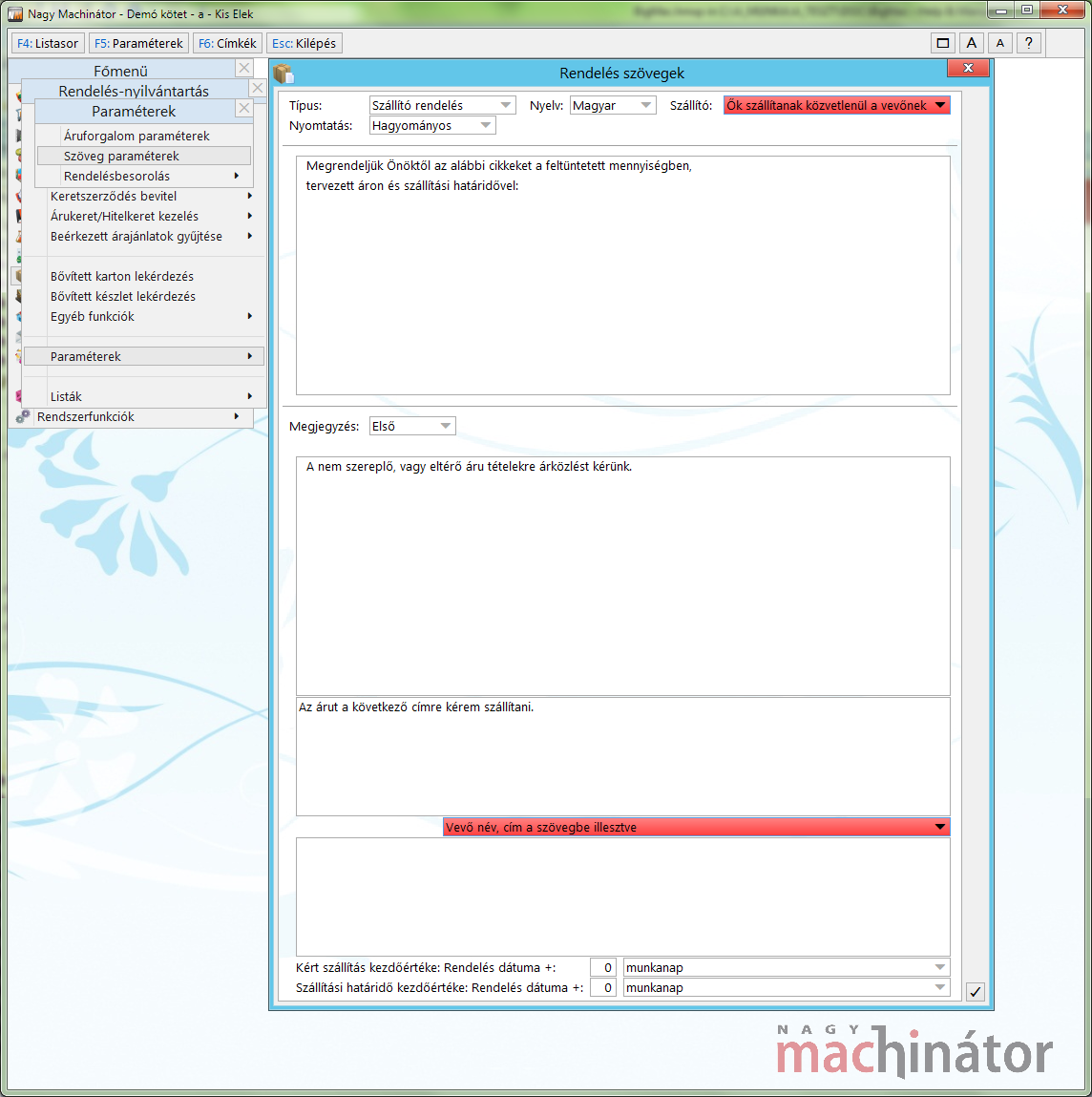 A Direkt szállítás esetén nyomtatandó rendelés paraméterezését a képen látható módon a Szöveg paraméterek funkcióban lehet végrehajtani.