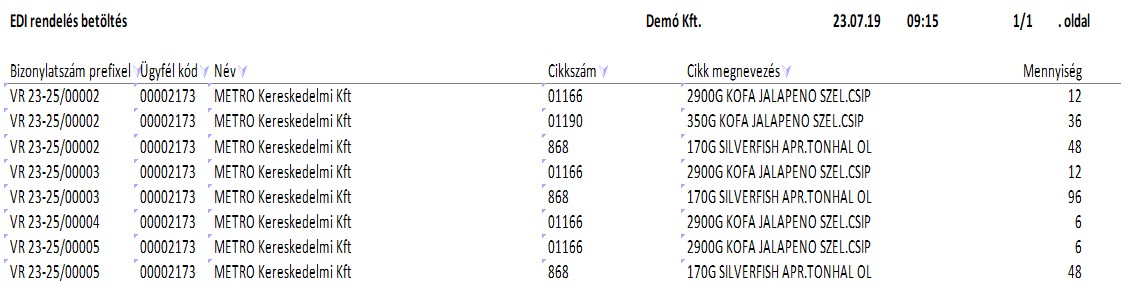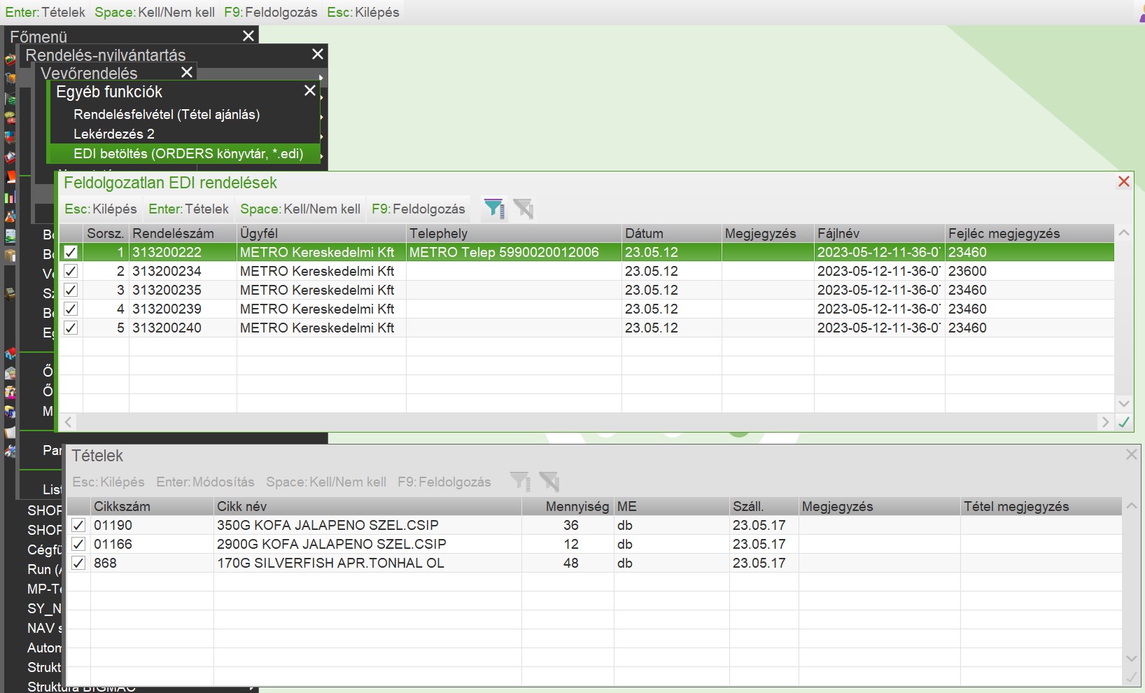 Az EDI betöltés menüpont elindítása után a program a beolvasott állományt rendelésekre tagolva jeleníti meg a képernyőn.