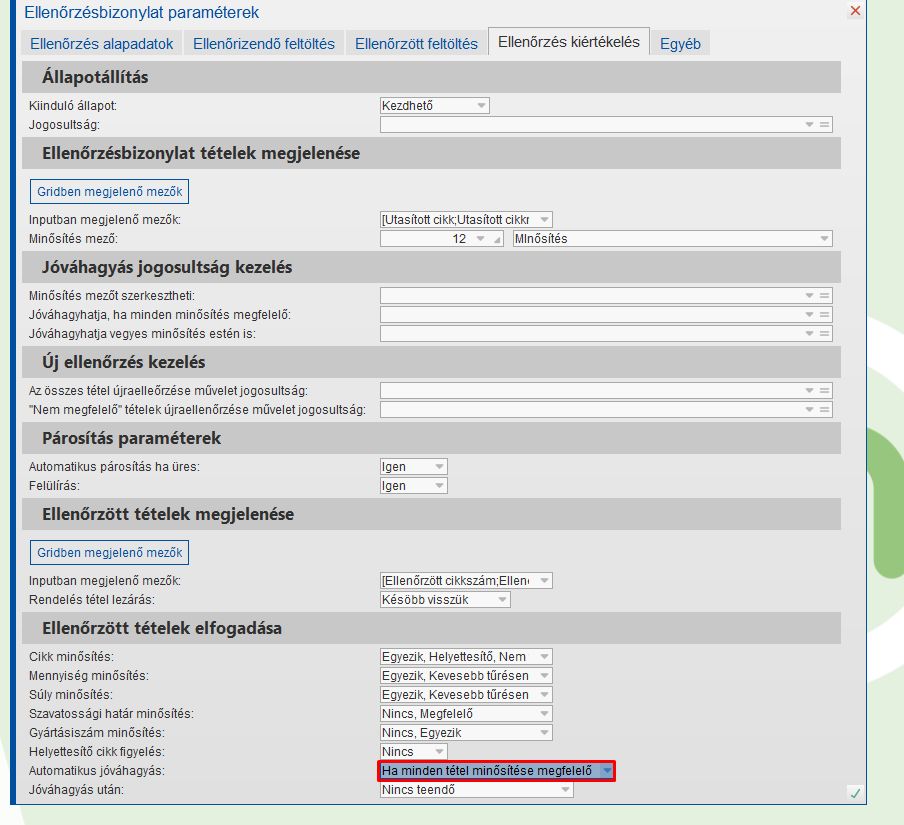 Igény esetén beállítható, hogy az ellenőrzés kiértékelése automatikusan fusson le a webes ellenőrzés után, és ha nem talál egyetlen olyan tételt sem a program, amely nem volt megfelelő, automatikusan végrehajtja a jóváhagyást és elkészíti a szállítólevelet.
