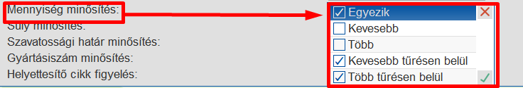 Az alábbi beállítás esetén, ha az ellenőrzött mennyiség kevesebb mint a komissiózott, akkor nem lesz megfelelő az ellenőrzés.