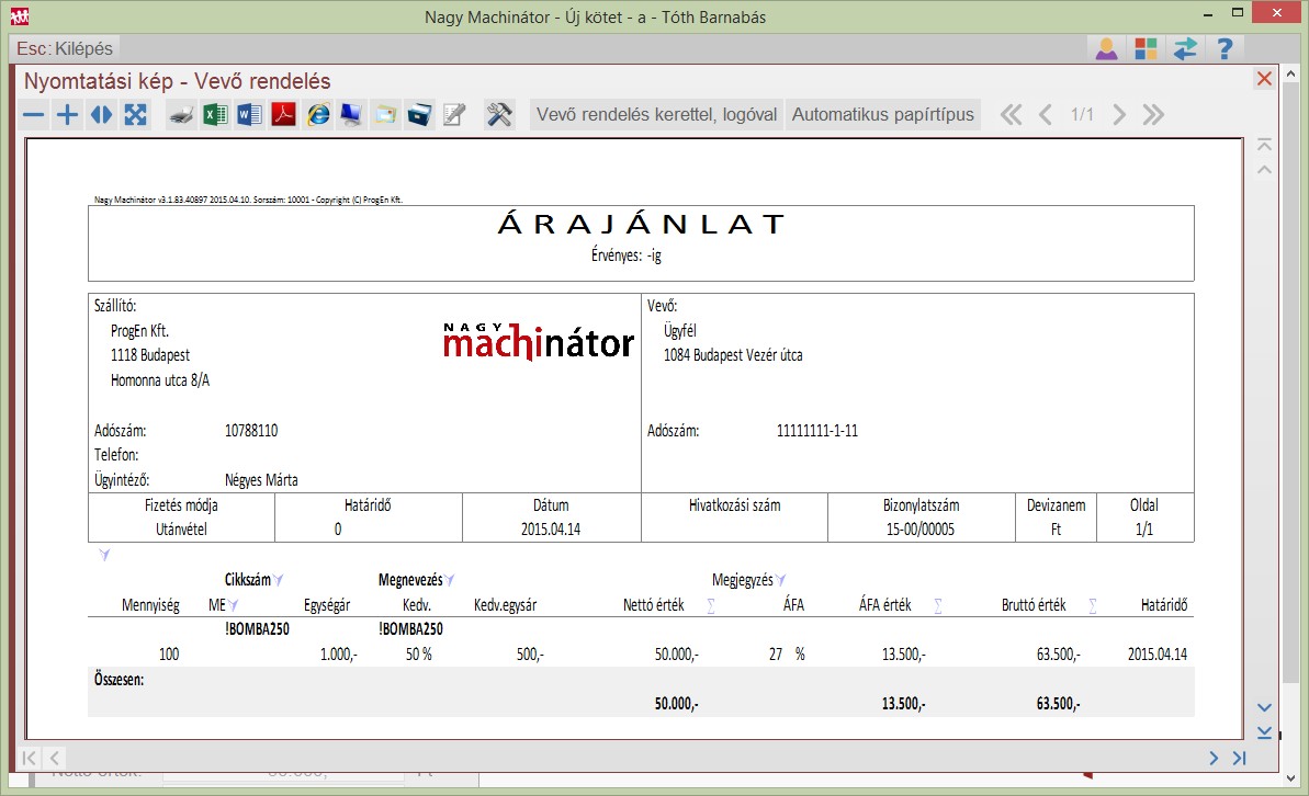 Attól lesz ajánlat a rögzített adat, hogy a tételek ún. kiinduló állapota Ajánlat lesz.