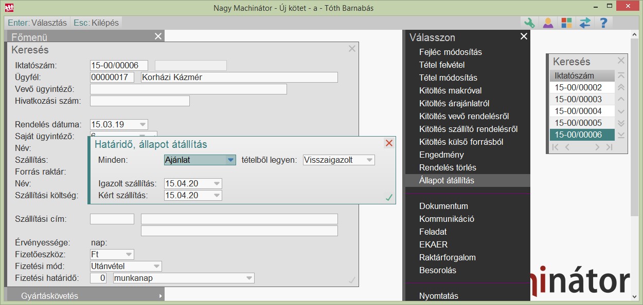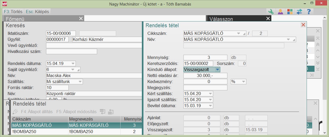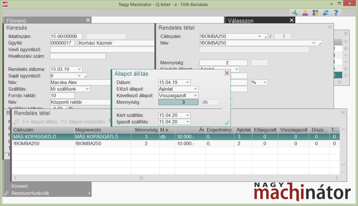 Amennyiben csak néhány tételt rendelnek meg, be kell menni a tétel módosítás ablakba és az F4:Állapot átállítás funkció elindítása után az aktuális tételre vonatkozóan kell megadni a képen látható módon, hogy mennyi lett megrendelve.