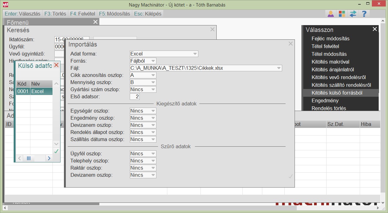 Előfordul, hogy a megrendelést Excel táblában küldi át a megrendelő. Erre az esetre lehet használni a Kitöltés külső adatforrásból funkciót.