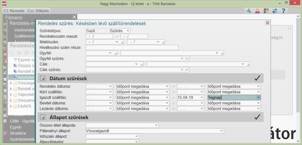 Amennyiben arra vagyunk kíváncsiak, hogy melyek azok a szállítórendelések, amelyeket már visszaigazolt a szállító, de már késésben vannak, a szűrést kell lemásolni és az alábbi szűrést beállítani.