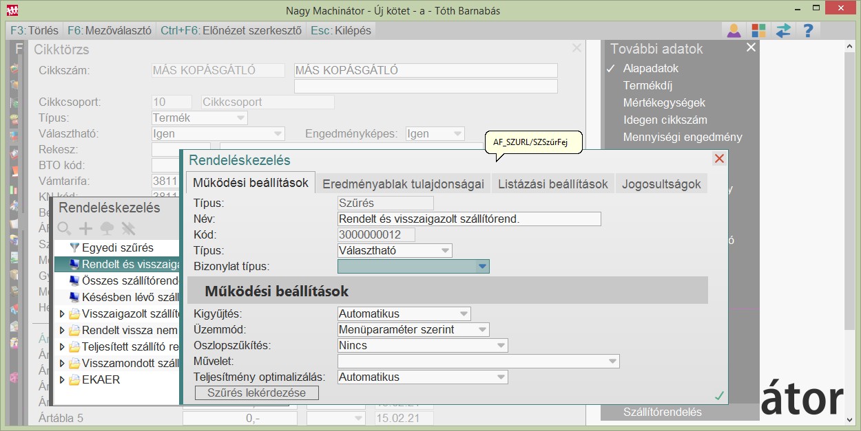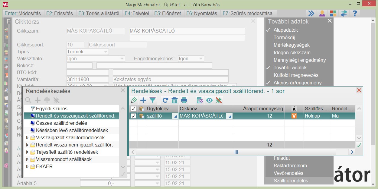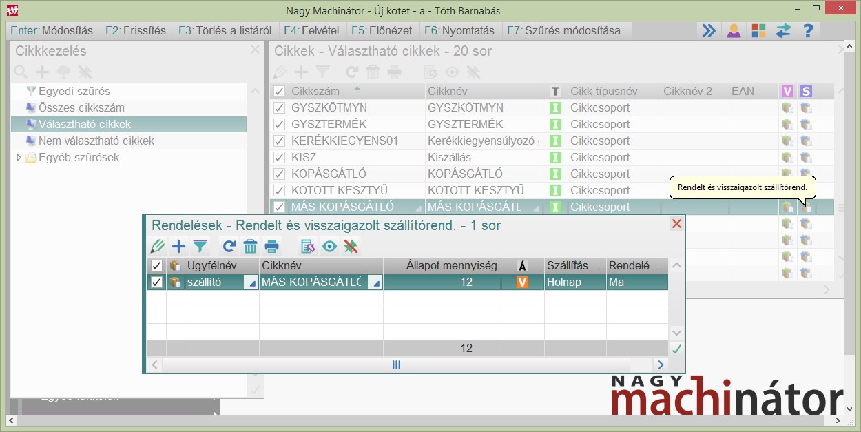 A Szállítórendelések lekérdezését cikk-kezelés funkcióból is el lehet indítani.