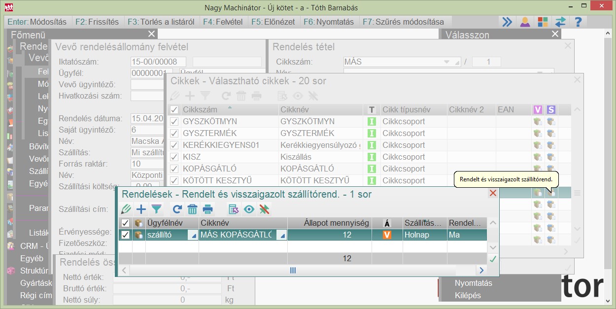 Bármelyik szállítórendelés lekérdezés meg tud jelenni a cikkválasztás során.