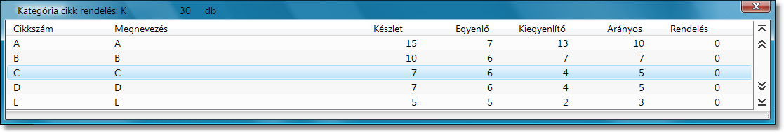 A funkció abban nyújt segítséget, hogy a rendelt Kategória cikk megadása után az éppen raktáron lévő, a kategóriába tartozó cikkeket egy képernyőn felsorolja.
