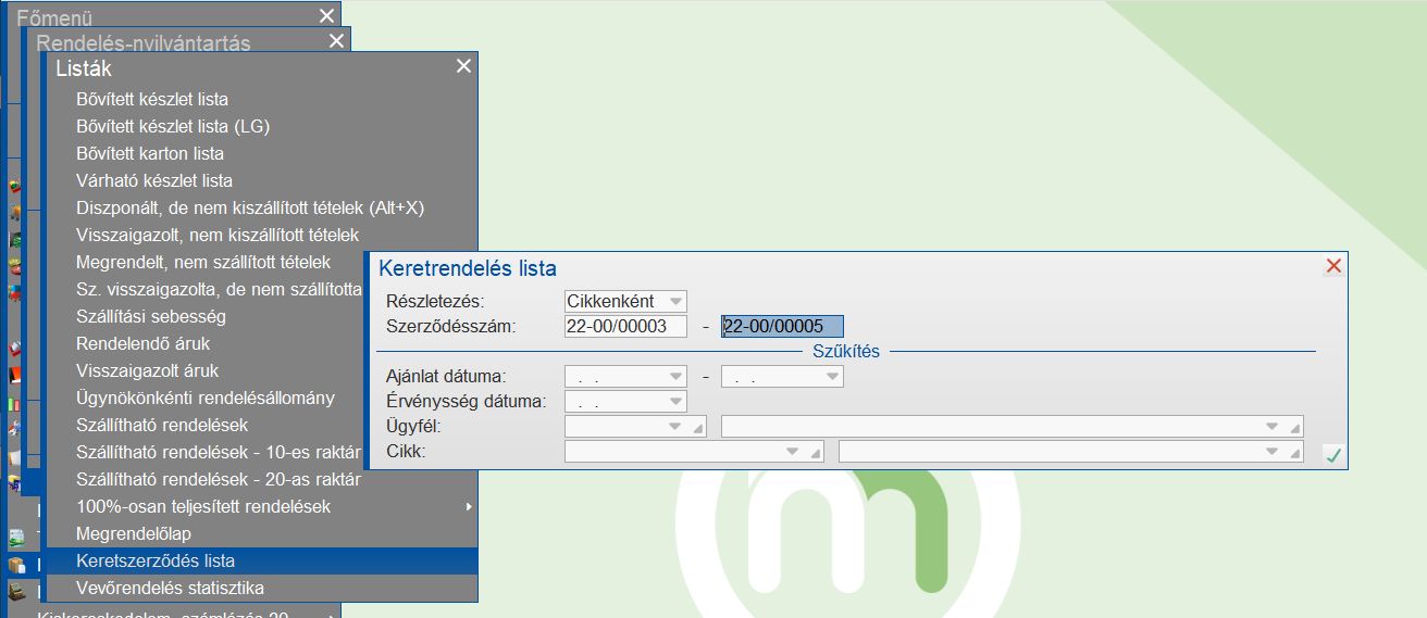 A programban lehetőség van arra, hogy a fent említett megbízási keretszerződésben a megbízó és megbízott által megállapodott feltételek alapján a keretrendelésben szereplő rendelés tételeket rögzíteni tudjuk. A szerződésben a felek által meghatározott cikkeket a hozzá tartozó kialkudott árakkal és érvényességgel tudjuk lerögzíteni.