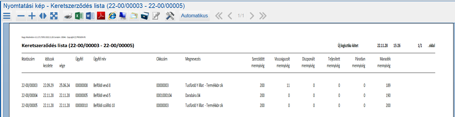A listázással tudjuk a meglévő keretszerződéseink állapotát megtekinteni, hogy milyen arányban van a fogyasztott és fennmaradt rész egymással szemben.