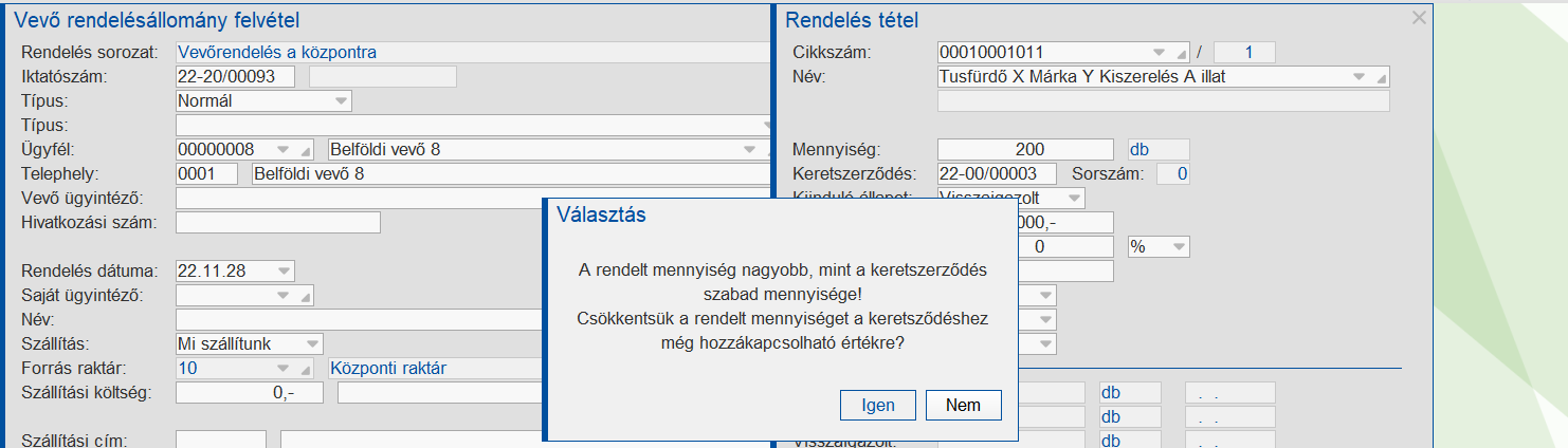 A vevőrendelés rögzítése közben a program jelezi, ha a hivatkozott tétel mennyisége már „elfogyott”, vagyis túlléptük a keretrendelésen még szabad mennyiséget.