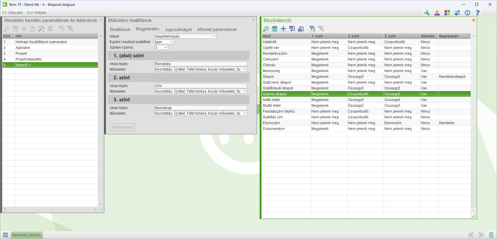 A mezőválasztóban kiválasztó értékek alapvetően a vevőrendelésben megadható adatok megjelenítésére vonatkozik.