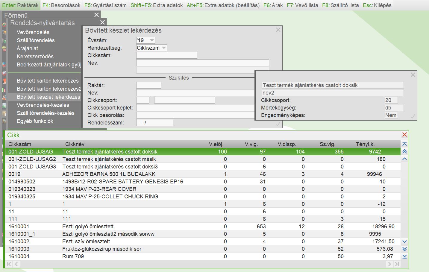 Ezzel az akcióval egy választott tárgyév tényleges készletét tekinthetjük meg (raktár és rendelésszám szűkítéssel) a képernyőn.
