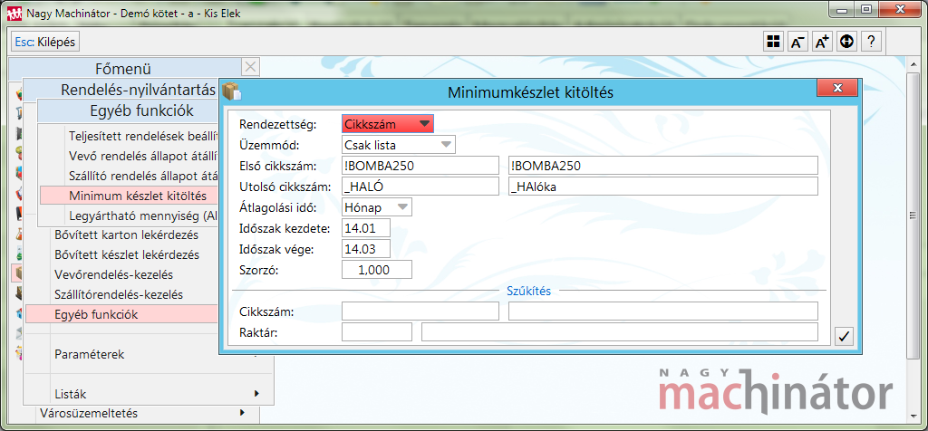 Ha nincs kitöltve a raktárszűkítés, akkor a minimumkészlet állományt raktárszűkítés nélkül veszi fel a program.